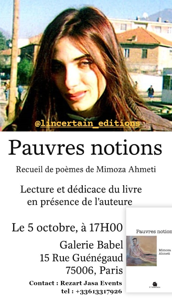 Mimoza Ahmeti, poétesse albanaise, a présenté à Paris le 5 octobre 2025 son livre de poésie Pauvres notions, publié chez L’Incertain en mai 2025. Elle a souhaité une présentation croisée avec le livre Le divan double, que j’ai écrit avec Philippe Moron, publié aux éditions Unicité en juin 2024.